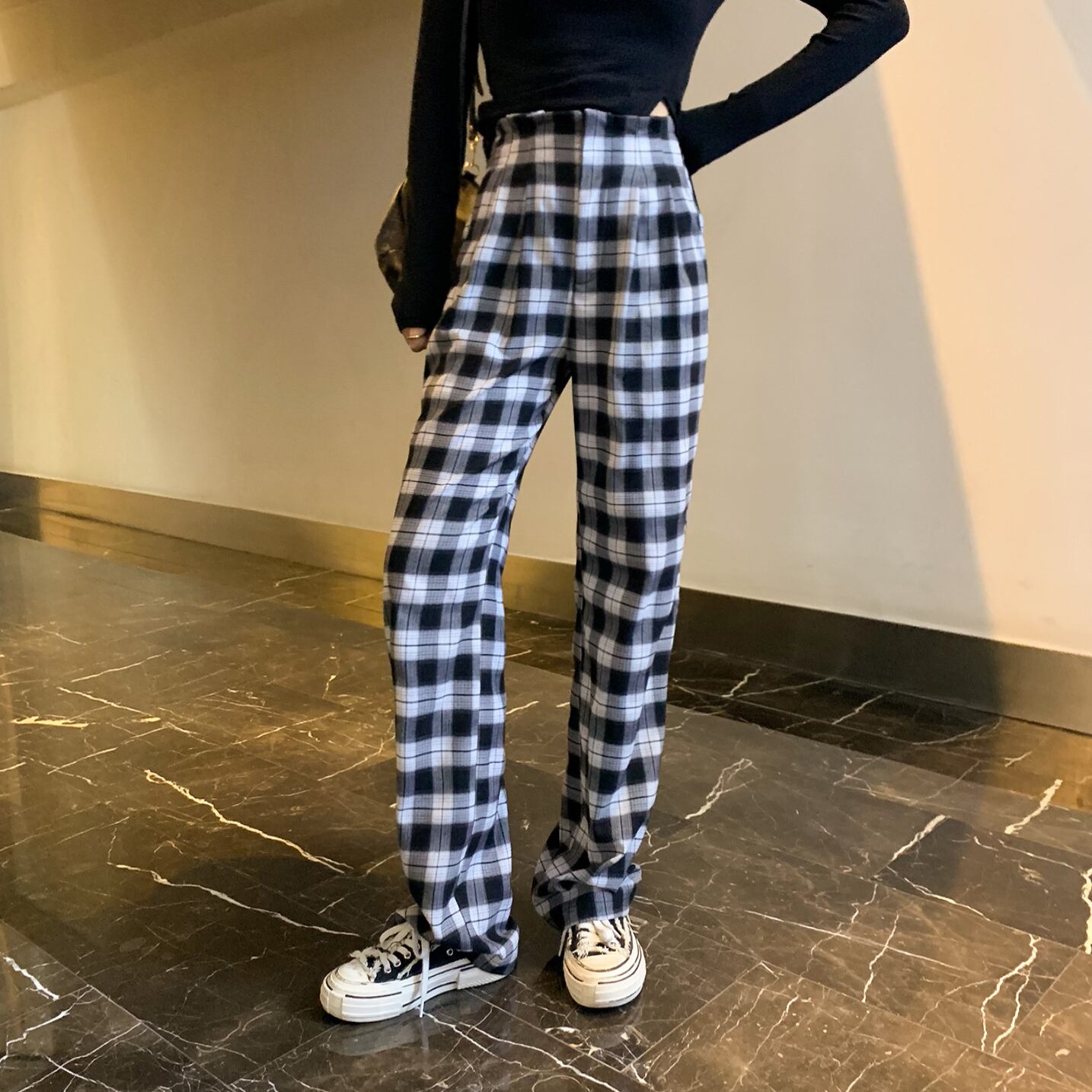 ウェストワイドレッグ格子柄パンツ レディーススプリングサマースタンダードルーズカジュアル レトロ 春物 夏物 ワイドパンツ 6Du_Shop_Women55197391047