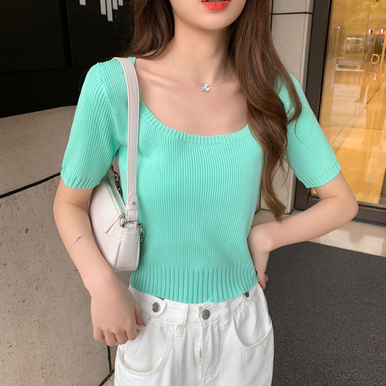 ショートスリム薄手ニットセーター サマートップス 夏物 スクウェア 6Du_Shop_Women76278496468