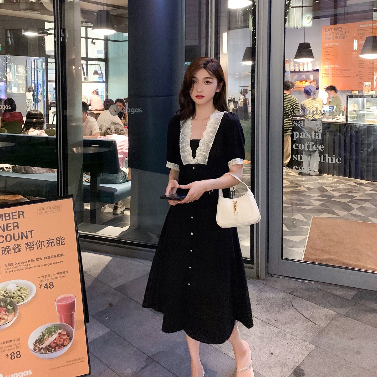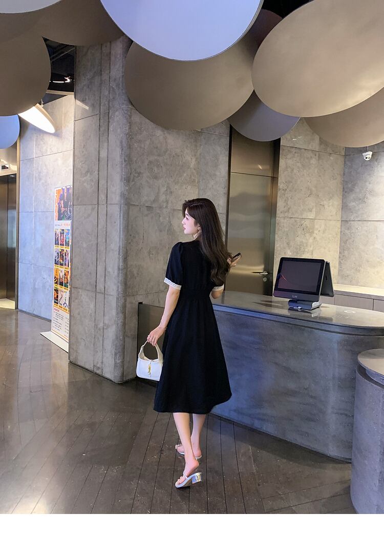 Vネックスタンダードウェストドレス サマースタイルブラック レトロ 夏物 6Du_Shop_Women19797376878
