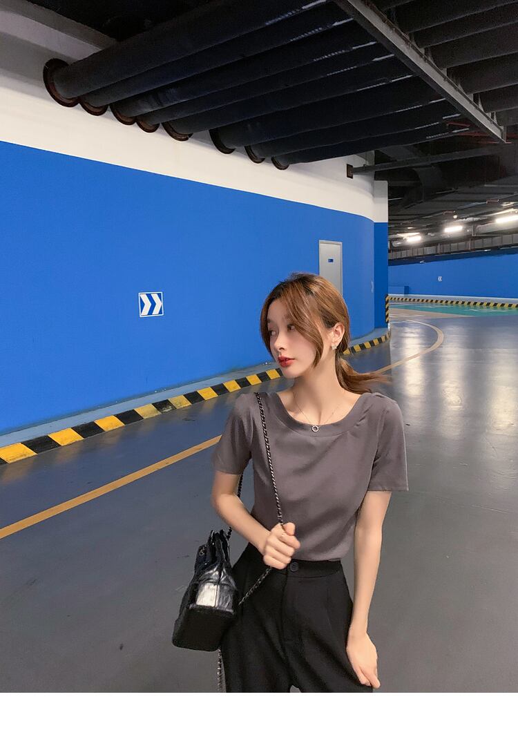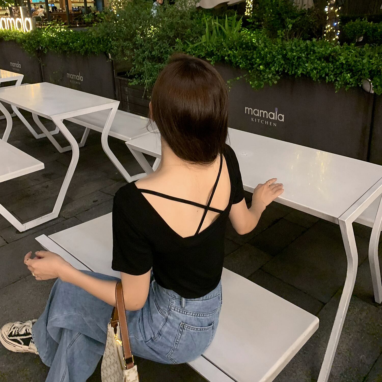 バッククロスラウンドネックTシャツ サマースタンダードスリムトップス レトロ 夏物 Oネック 6Du_Shop_Women19081350476